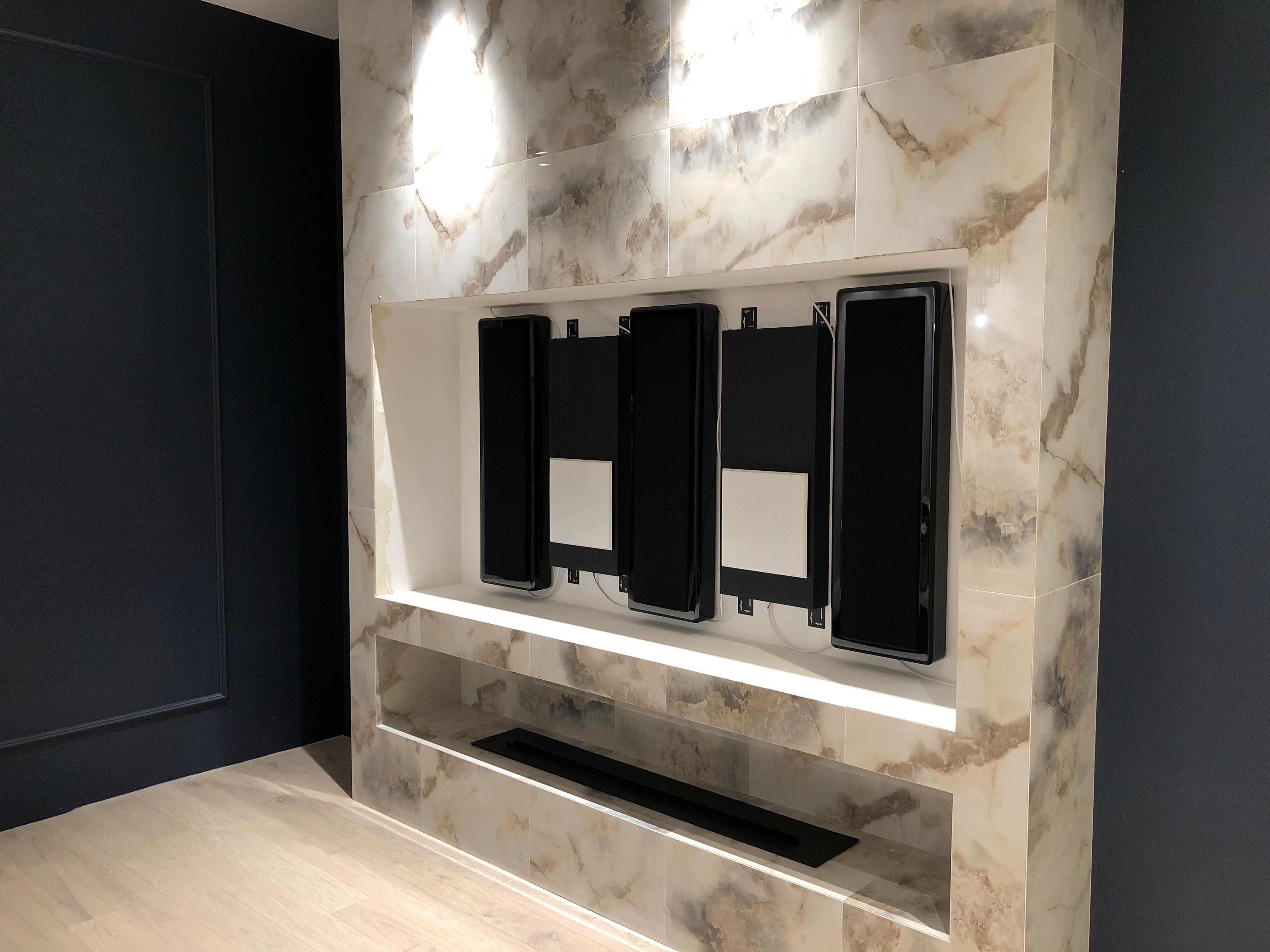 Miller & Kreisel IW950 LCR speakers and Miller & Kreisel C15S subwoofers are concealed behind a woven acoustically transparent screen. Surround channels are handled by wall-mounted Miller & Kreisel M70 speakers, while Atmos channels are delivered through ceiling-mounted Miller & Kreisel IC95 speakers.