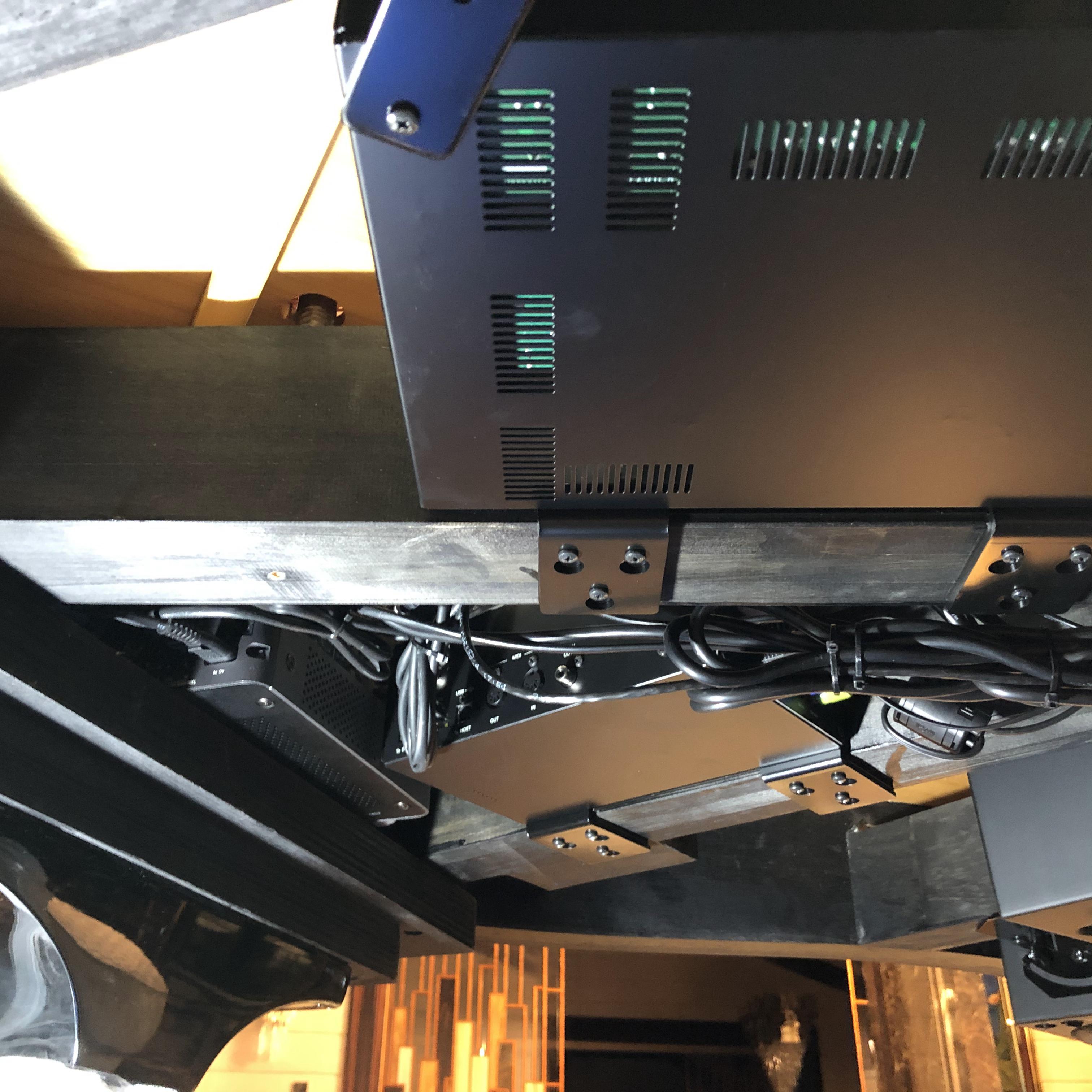 Smaller accessories, including an RTI universal remote, tablet, PS5 controllers, karaoke microphones, and charging outlets, were discreetly integrated into a hidden, ventilated cabinet. The JVC DLA-NZ7 projector was also installed in the technical room and placed on an equipment rack.